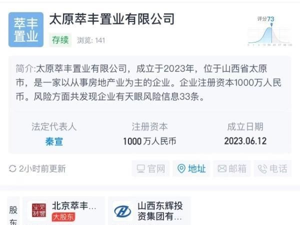 天眼查显示,太原萃丰置业有限公司位于山西省太原市,是一家以从事房地产业为主的企业,法定代表人为秦宣,企业注册资本1000万元人民币,实缴为0,目前仅有3名员工,除了秦宣外,还有监事孙雅君和财务负责人张强。