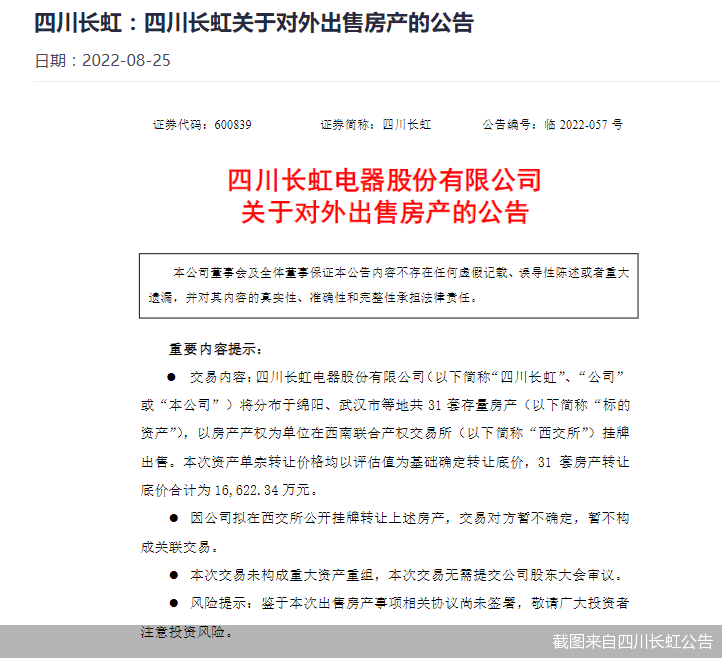 8月24日晚间,四川长虹要一口气卖31套房产的消息引发市场关注。