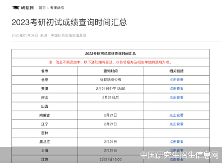 北京商报记者注意到,目前,中国研究生招生信息网已披露多省市的2023考研初试成绩查询时间。其中,天津、内蒙古、辽宁、黑龙江、上海、江苏、浙江等多地均为2月21日当日开放成绩查询;湖北、广西等地稍晚,为2月22日开放查询服务。