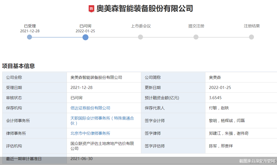 作为一家智能装备制造生产商,奥美森智能装备股份有限公司(以下简称“奥美森”)也要冲击A股了。深交所官网显示,奥美森创业板IPO已进入问询状态。北京商报记者了解到,奥美森实控人之一龙晓斌曾有过一段警官任职经历,这在IPO市场上颇为罕见。另外,此番冲击创业板,奥美森最新披露报告期业绩似乎也不给力,2021年上半年实现净利865.8万元,较2020年全年业绩有一定差距。对此,北京商报记者在新三板市场查询了奥美森2020年上半年净利情况,约为1261.61万元,经计算,奥美森2021年上半年净利同比下降超三成。