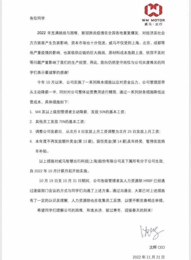 内部信显示,从今年10月起,威马汽车M4及以上级别管理者主动降薪,发放50%的基本工资,其他员工发放70%的基本工资。同时,调整公司发薪日,从次月8日发放上月工资调整为次月25日发放上月工资。此外,该内部信中还提到,本年度不再发放额外奖金(第13薪)、留任奖金(第14薪)及年终奖,暂停发放购车补贴。针对内部信的真实性,一位威马汽车员工对北京商报记者表示:“确已收到该内部信。”