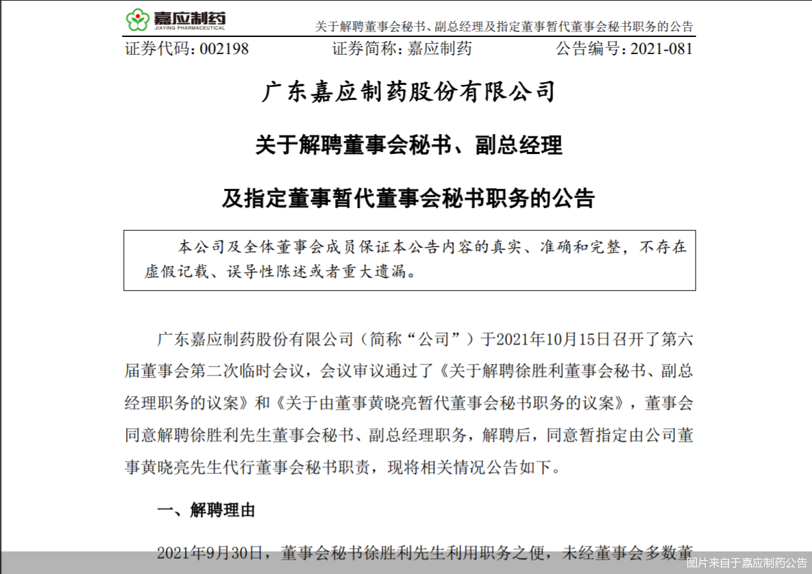 嘉应制药表示,9月30日,董秘徐胜利利用职务之便,未经董事会多数董事同意,擅自向深交所提交以董事会名义起草的关注函回复公告,严重干扰公司董事会正常的工作秩序。为保障公司董事会正常的工作秩序,同意解聘徐胜利董秘、副总经理职务,解聘后徐胜利除担任董事职务外,不在公司担任其他任何职务。