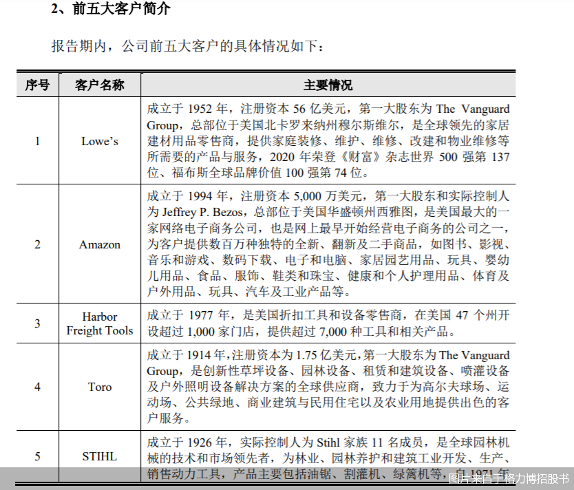 对于客户集中度较高的问题,格力博称,报告期内,格力博与前五大客户的合作均具有一定历史,大部分客户的合作历史在五年及以上;格力博的下游客户主要为商超、电商渠道客户以及知名品牌商,其中与商超类客户的业务为销售自有品牌产品或为商超贴牌,与园林机械品牌商的业务为ODM业务,相关业务具有稳定性及可持续性。