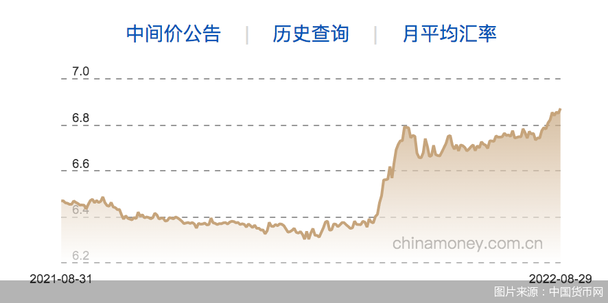 8月29日,央行授权中国外汇交易中心公布,2022年8月29日银行间外汇市场人民币汇率中间价为:1美元对人民币6.8698元,前一交易日报6.8486元,调降212个基点。由此计算,与7月最后一个交易日相比,8月人民币汇率累计调降1261个基点。