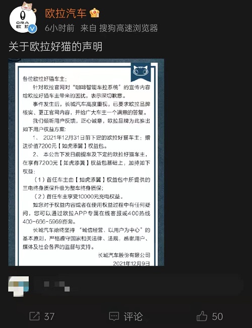 事实上,众多车主认为欧拉品牌发布的声明没能解决根本问题。此前,欧拉品牌曾发布第一版解决方案,其中包括向有关车主赠送价值7200元的权益包,包括升级Car play及HiCar功能,延长两年免费娱乐流量包等。本次解决方案中,仅增加公告下发日前提车及下定的欧拉好猫车主,在享有7200元“如虎添翼”权益包基础上,增加首任车主由“如虎添翼”权益包中所提供的三电终身质保升级为整车终身质保及首任车主享受1万元充电权益。