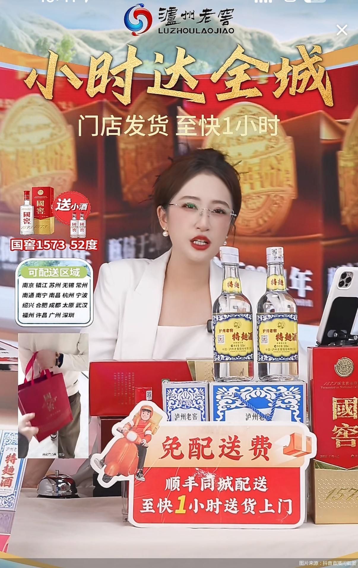 北京商报记者了解到,泸州老窖“小时达”新店目前可配送区域有南京、镇江、苏州、无锡、成都、广州、深圳等19个城市。据悉,泸州老窖采用“直播+即时零售”模式,通过抖音旗舰店直播间实现“观看—下单—配送”闭环,有效打通线上线下营销。