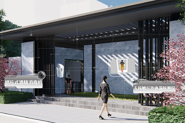 通过无接触式红外线体温检测仪及无接触感应酒精消毒机,让业主在社区入口的灭菌站,即能彻底将病毒隔离在园外;完善整个快递外卖收发链,并针对性设置专项集中消毒区。设置专业、独立的生化垃圾回收区,避免社区出现交叉感染的可能。