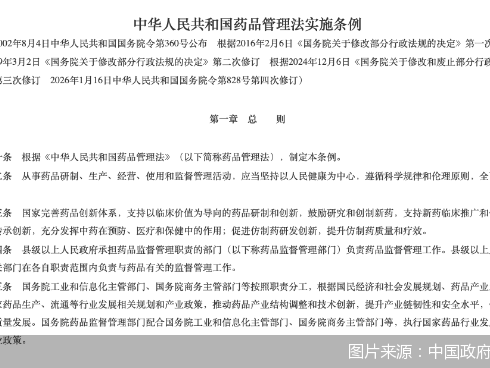 1月27日,新修订的《中华人民共和国药品管理法实施条例》(以下简称《条例》)发布,将于2026年5月15日正式实施。这是自2002年公布施行以来,该条例首次进行全面修订,旨在总结近年来药品监管改革经验,细化药品管理法规定的制度措施,深化药品监管改革。《条例》明确国家支持儿童用药品、罕见病治疗用药品的研制和创新,首次引入儿童用药品及罕见病药品市场独占期制度。