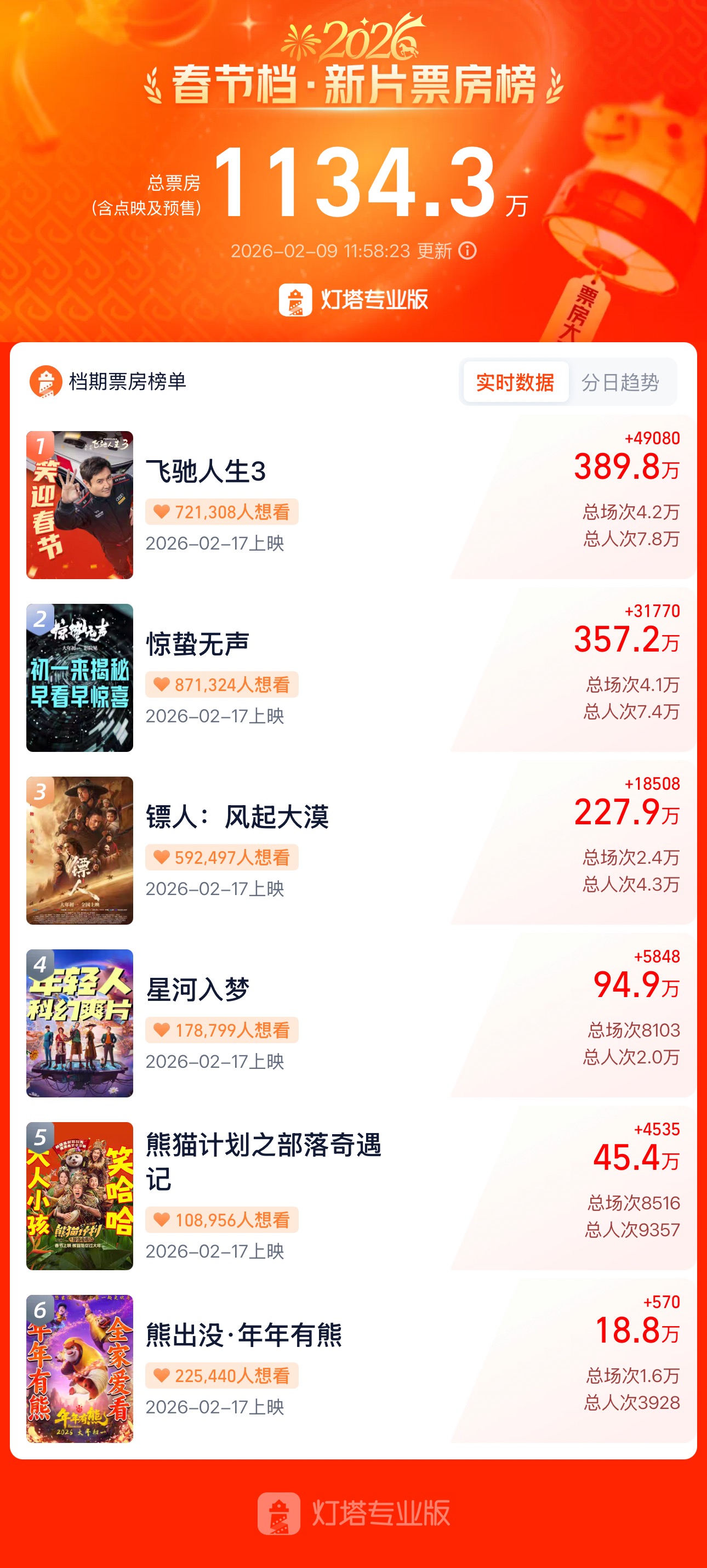 截至11时57分,2026春节档新片预售总票房已突破1000万。