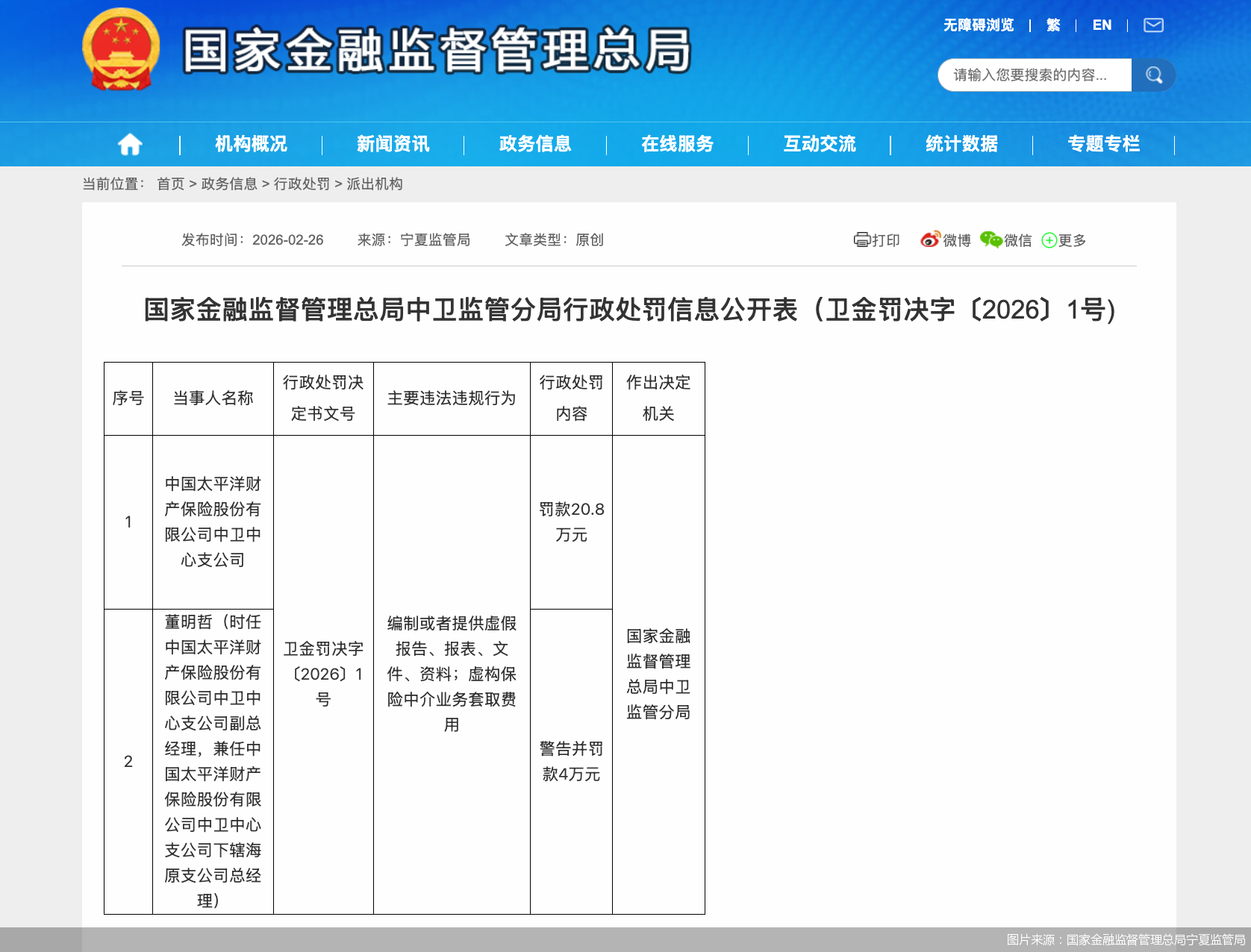 北京商报讯(记者 胡永新)国家金融监督管理总局中卫监管分局发布的行政处罚信息显示,中国太平洋财产保险股份有限公司中卫中心支公司因编制或者提供虚假报告、报表、文件、资料;虚构保险中介业务套取费用,被罚款20.8万元。时任中国太平洋财产保险股份有限公司中卫中心支公司副总经理,兼任中国太平洋财产保险股份有限公司中卫中心支公司下辖海原支公司总经理董明哲被警告并罚款4万元。