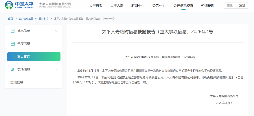 北京商报讯(记者 李秀梅)3月10日,北京商报记者注意到,太平人寿保险有限公司(以下简称“太平人寿”)日前公告,2025年12月19日,太平人寿第九届董事会第一次临时会议审议通过王旭泽担任公司总经理事项。