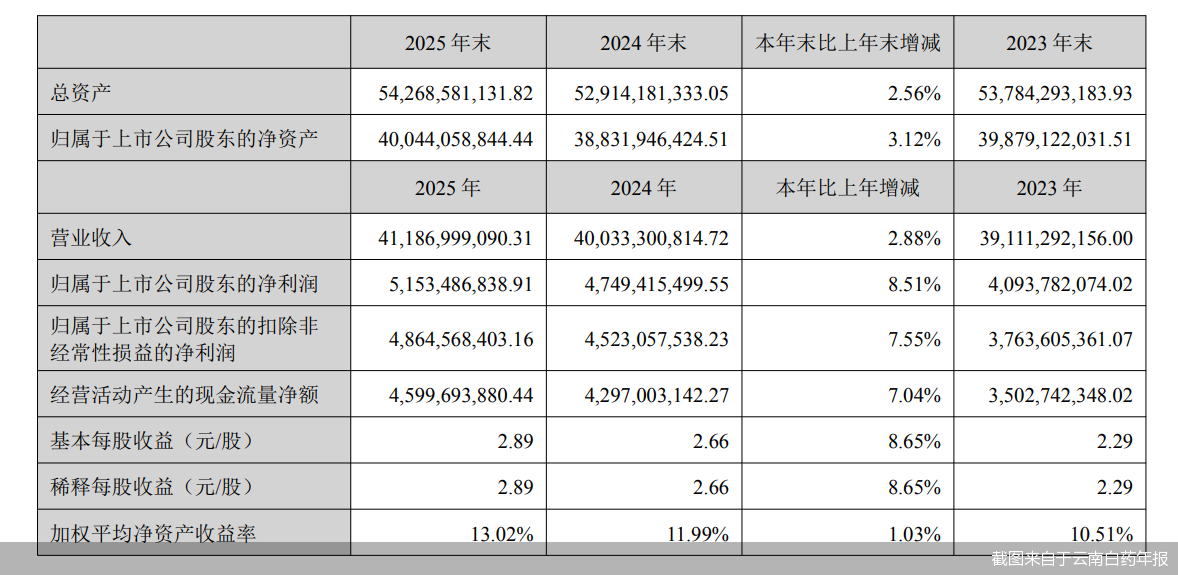 云南白药2025年年报显示,2025年,公司实现营业收入411.87亿元,同比增长2.88%;归属净利润51.53亿元,同比增长8.51%;扣非净利润48.65亿元,同比增长7.55%。其中,营业收入、扣非净利润均创下历史新高。