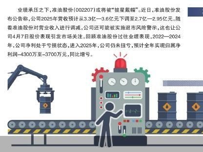 业绩承压之下,准油股份(002207)或将被“披星戴帽”。近日,准油股份发布公告称,公司2025年营收预计从3.3亿—3.6亿元下调至2.7亿—2.95亿元。随着准油股份对营业收入进行调减,公司还可能被实施退市风险警示,这也让公司4月7日股价表现引发市场关注。回顾准油股份过往业绩表现,2022—2024年,公司净利处于亏损状态,进入2025年,公司仍未扭亏,预计全年实现归属净利润-4300万至-3700万元,同比增亏。