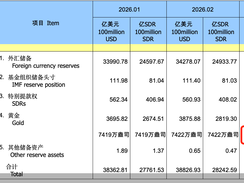 4月7日,国家外汇管理局发布统计数据显示,截至2026年3月末,我国外汇储备规模为33421亿美元,较2月末下降857亿美元,降幅为2.5%。此外,人民银行更新的官方储备资产统计显示,截至3月末,我国黄金储备为7438万盎司,环比增加16万盎司,为连续第17个月增加。