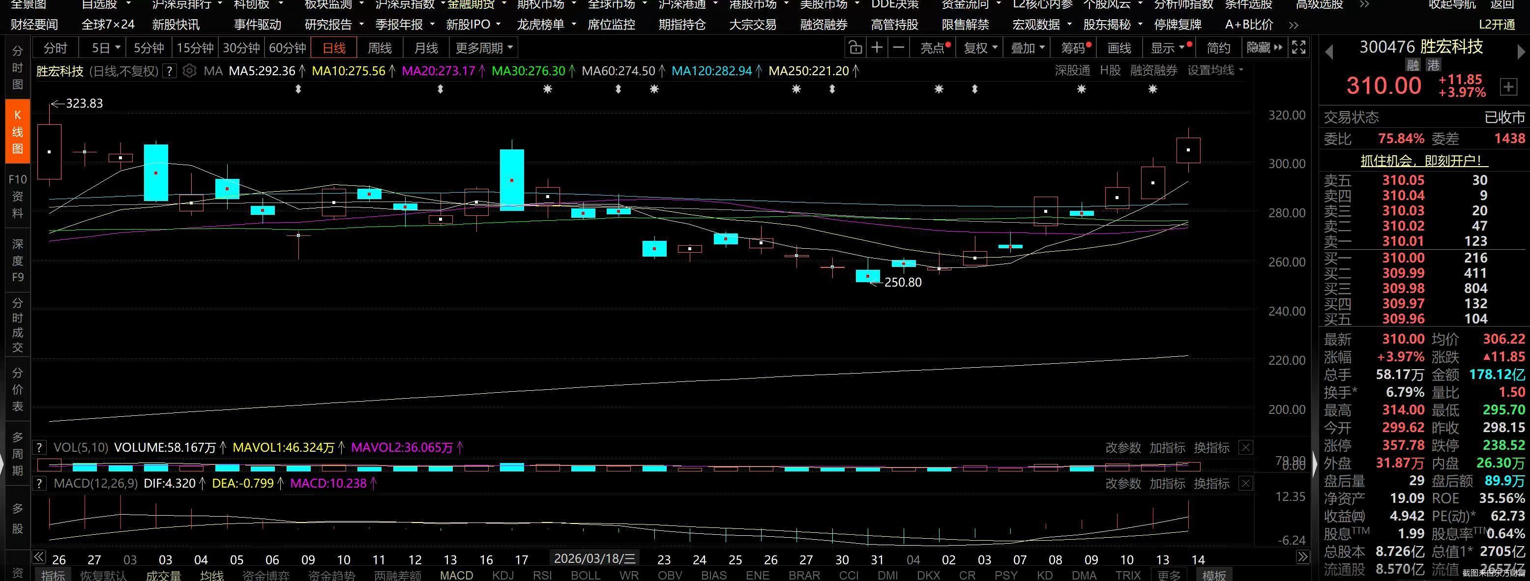 二级市场方面,截至4月14日收盘,胜宏科技股价报310元/股,总市值2705亿元。拉长时间来看,3月31日—4月14日这10个交易日内,公司股价接连震荡上行,区间累计涨幅20.49%。