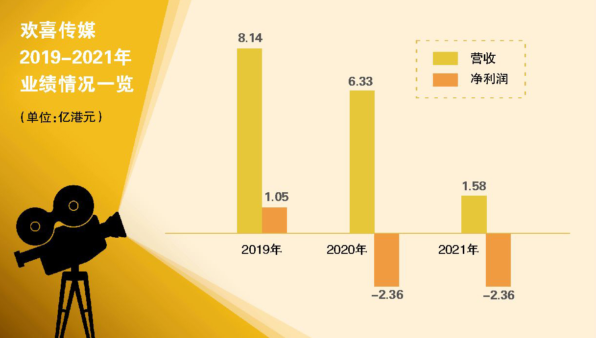 2021年财报显示,欢喜传媒报告期内持续经营业务收益为1.58亿港元,同比下降75%,归属于母公司净亏损约为2.36亿港元,亏损同比减少0.35%。