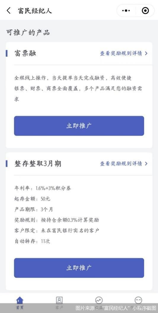 在实测过程中,北京商报记者注意到,富民银行推出了一项名为“富民经纪人”的存贷汇产品推广平台,个人或该行用户合作渠道通过推广富民银行的产品就可以获得奖励。