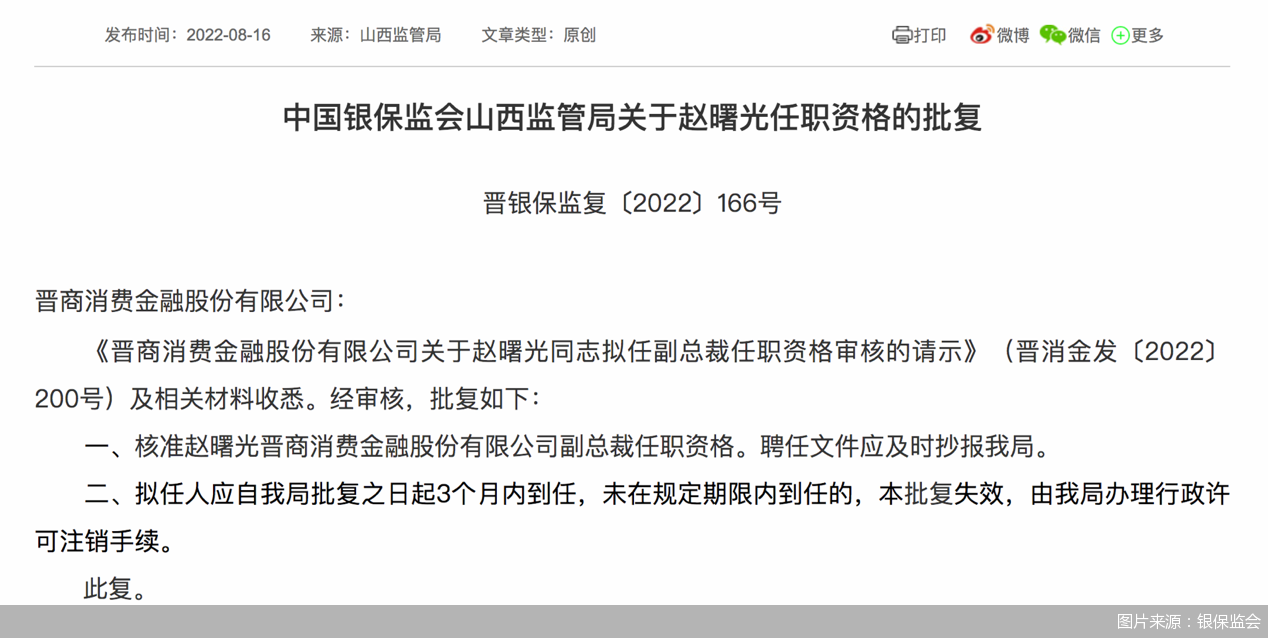 赵曙光也是晋商消费金融的一员“老将”。早在2016年12月,银保监会山西监管局(前身为“山西银监局)核准赵曙光担任晋商消费金融首席财务官。彼时,晋商消费金融成立尚不足一年。
