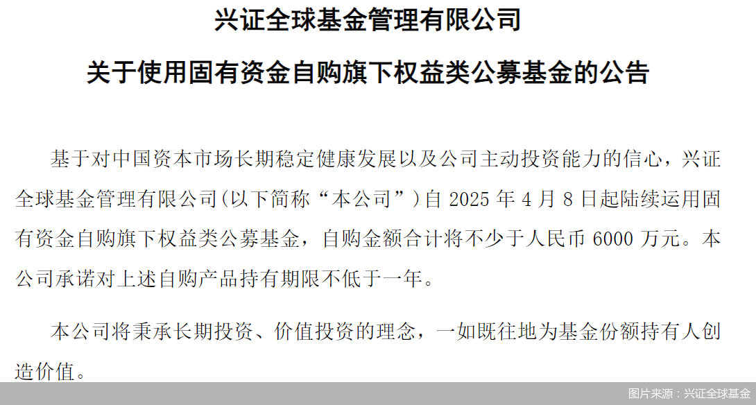兴证全球基金:4月8日起以不少于6000万元固有资金自购旗下权益类基金