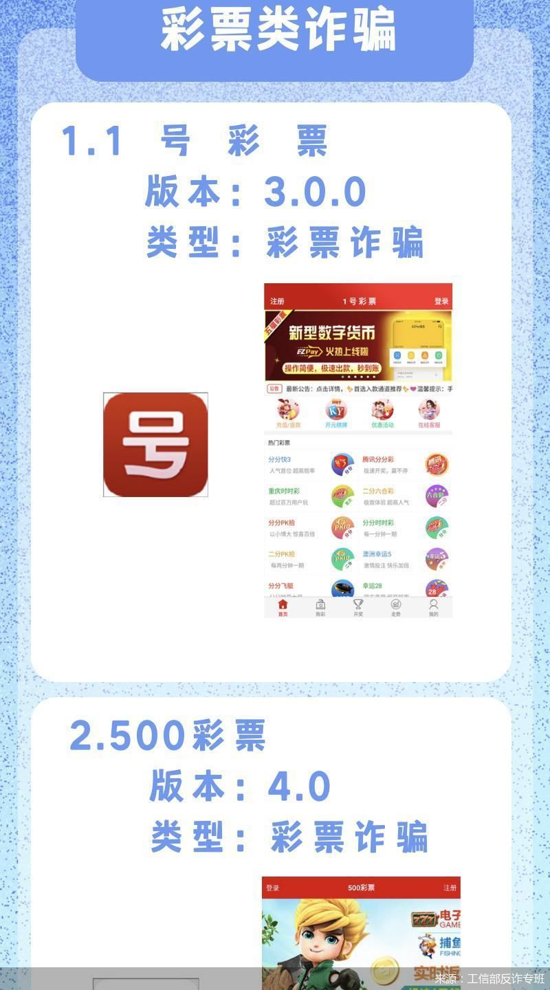 根据工信部反诈专班发文披露的新一批涉诈高风险彩票类诈骗App来看,其中包括1号彩票(版本3.0.0)、500彩票(版本:4.0)、2050彩票(版本:4.0)、彩球(版本:3.0.0)、彩名堂(版本:2.9.45)、环彩网(版本:2.9.45)、吉祥彩票(版本:3.0.0)、奖多多彩票(版本:3.0.0),共8款彩票诈骗软件。