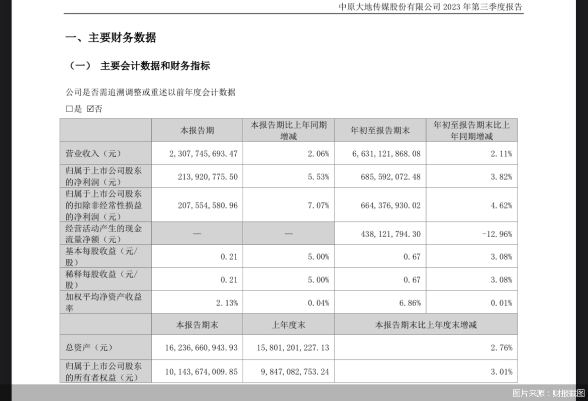 北京商报讯(记者 卢扬 韩昕媛)10月26日,中原传媒发布2023年前三季度报告,营业收入66.31亿元,同比增长2.11%。归属于上市公司股东的净利润6.86亿元,同比增长3.82%。