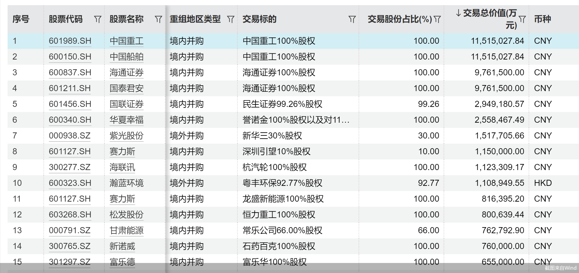 另外,经Wind统计,包含中国船舶、中国重工在内,共计10股所筹划重大重组事项交易总价值超100亿元,另外8股分别为海通证券、国泰君安、国联证券、华夏幸福、紫光股份、赛力斯、海联讯、瀚蓝环境,据Wind显示,其交易总价值分别约为976.15亿元、976.15亿元、294.92亿元、255.85亿元、151.77亿元、115亿元、112.33亿元、110.89亿元。