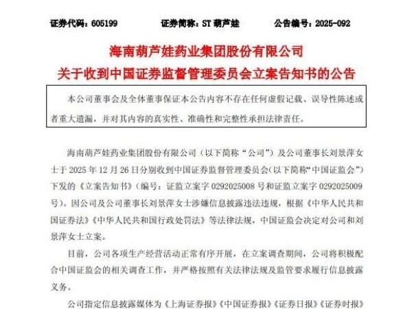 儿药龙头ST葫芦娃正深陷合规与业绩的双重泥潭。12月28日,ST葫芦娃发布公告称,公司及董事长刘景萍收到中国证监会下发的《立案告知书》,因涉嫌信息披露违法违规,监管层决定正式立案。这已是该公司继财务造假被责令改正、内控失效导致“戴帽”、业绩预告违规迟报之后,监管层对公司治理失序的又一次严厉追责。