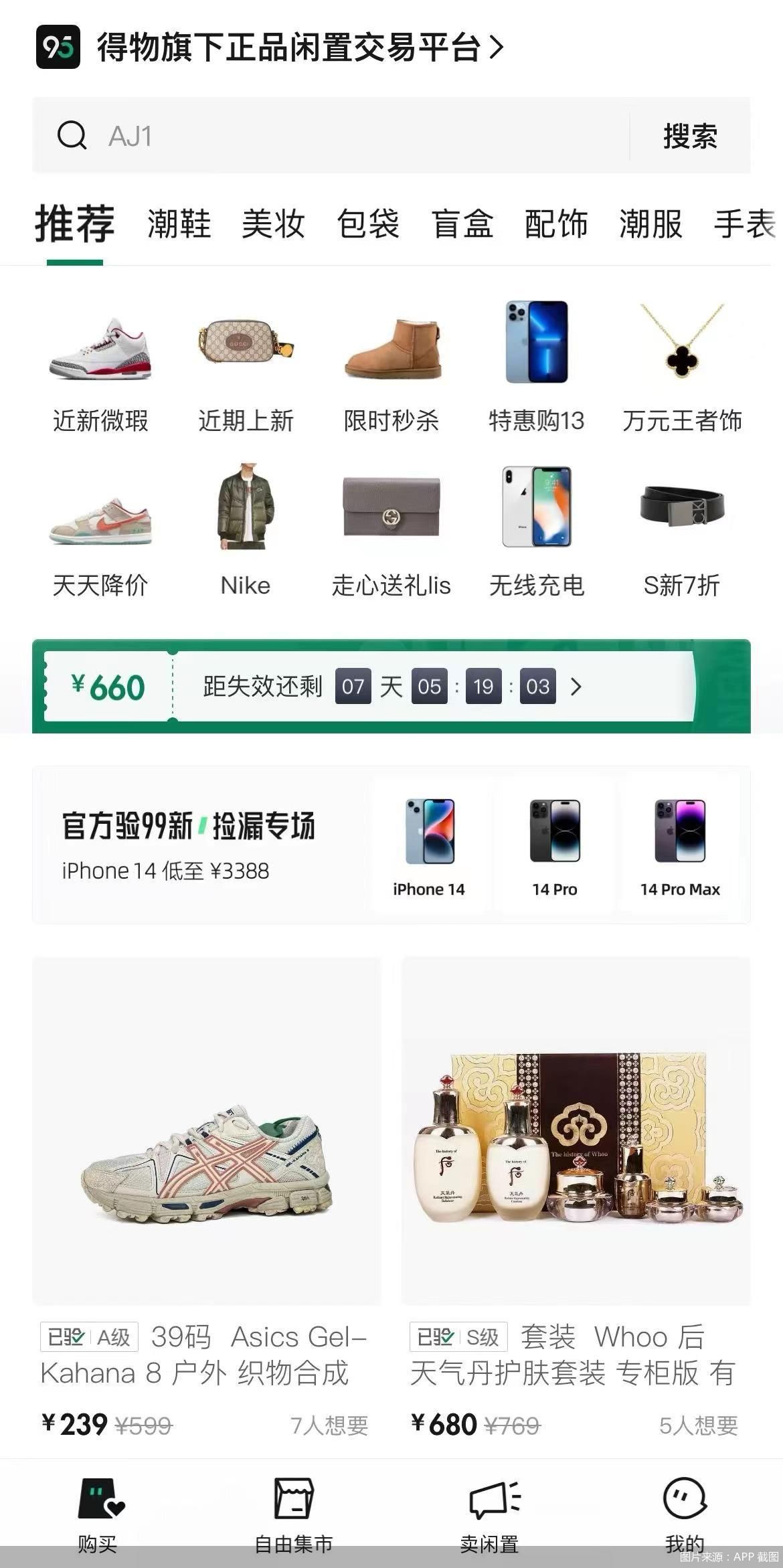 二手电商市场,出现了一个新“得物”。当用户打开得物App,会随机收到“95分”的弹窗介绍。据了解,得物旗下的“95分”App,是一个闲置好物交易平台。目前,“95分”不但有独立的App,还在得物App里有“专属”界面:用户在得物的“探索”和“我”频道均能进入“95分”界面。“95分”的二手品类集中在鞋包、服饰手表、手机数码、美妆。在售卖服务模式上,“95分”推出了寄售、挂售和回收三类。