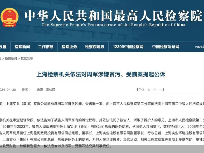 海正药业、上海医药前高管被查的原因与受贿有关。4月30日,据最高人民检察院消息,上海检察机关对上海实业(集团)有限公司原总裁周军涉嫌贪污、受贿案提起公诉。2016年10月至2023年11月18日,周军任上海医药董事长。海正药业披露的公告显示,公司前董事、前总裁李琰2019年至2022年期间在公司代理业务中涉嫌贪污罪、职务侵占罪、受贿罪、非国家工作人员受贿罪,目前相关部门正在调查过程中。