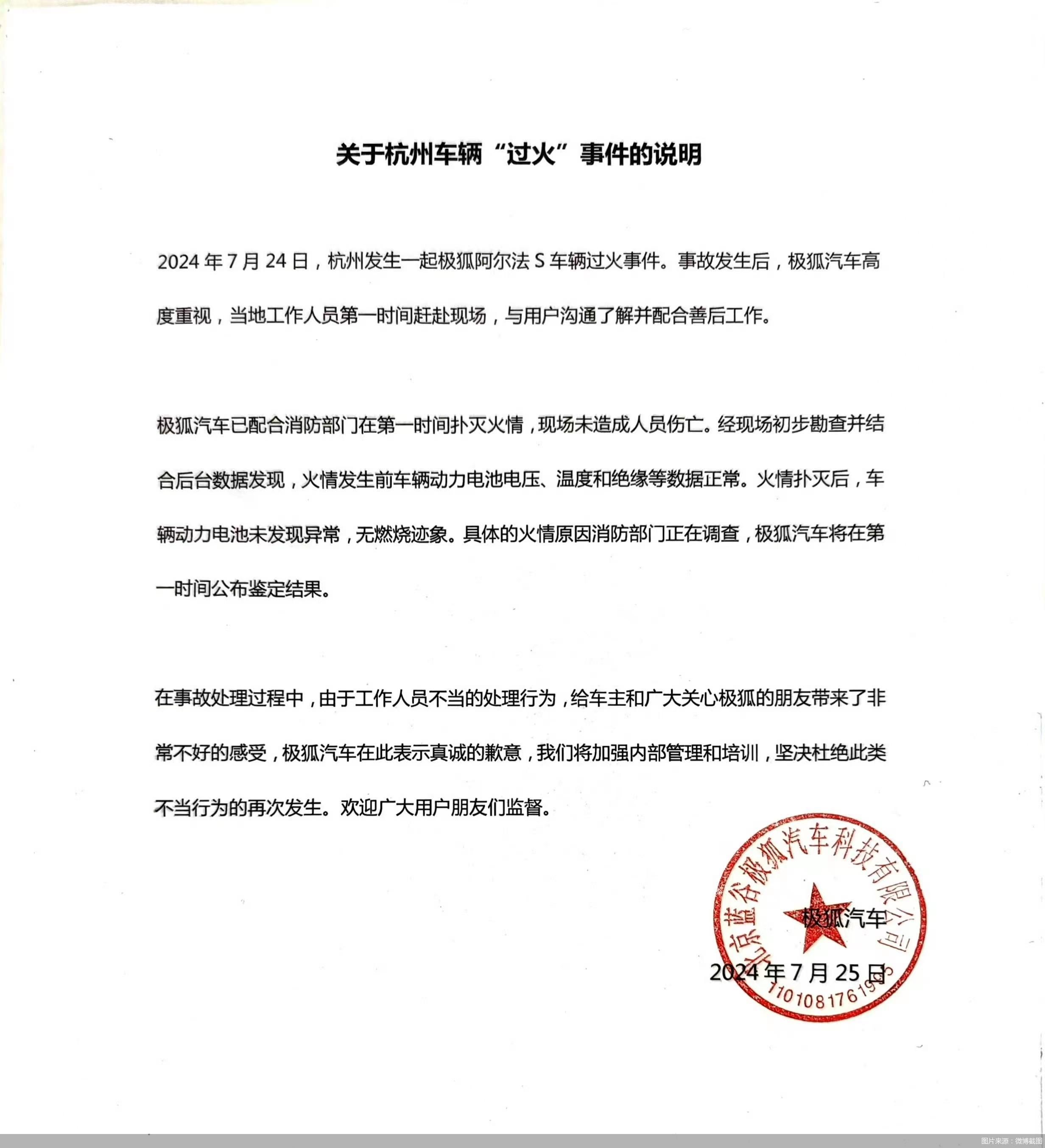 车辆发生自燃,极狐汽车回应:动力电池无燃烧痕迹,就工作人员不当处理行为致歉