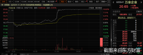 交易行情显示,万业企业11月27日股价出现“抢跑”,当日午后在大额买单推动下,公司股价迅速封上涨停板,之后盘中几度打开涨停,但最终仍封死涨停。截至收盘,万业企业股价报涨停价20.65元/股,总市值为192.2亿元,当日成交金额9.7亿元,较前几个交易日出现明显放量。