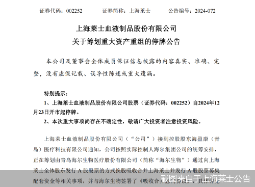 12月23日,海尔生物、上海莱士先后发布筹划重大资产重组的停牌公告显示,海尔生物与上海莱士正在筹划由海尔生物通过向上海莱士全体股东发行A股股票的方式换股吸收合并上海莱士并发行A股股票募集配套资金。
