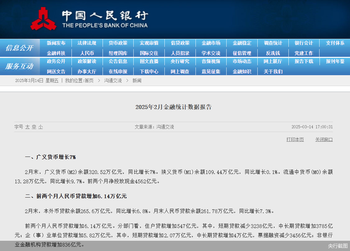 最新一期金融数据出炉,释放多个信号。3月14日,人民银行官网发布的2025年2月金融统计数据报告显示,M2增速基本稳定,社会融资规模增速加快,贷款规模合理增长,信贷结构出现不少亮点。尤其是,2月份企业新发放贷款利率约3.3%,个人住房新发放贷款利率约3.1%,贷款利率保持在历史低位水平。