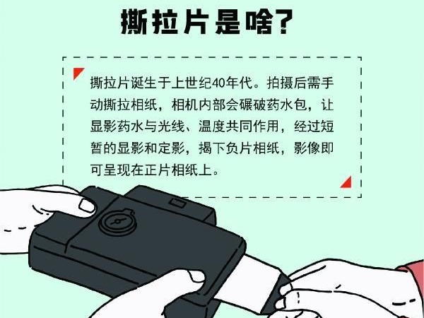 相关资料显示,作为一种即时成像的技术,撕拉片最早是由宝丽来公司在20世纪中期发明。因拍摄后需手动撕拉相纸,相机内部会碾破药水包,让显影药水与光线、温度共同作用,经过短暂的显影和定影,揭下负片相纸,影像即可呈现在正片相纸上,因而被称作“撕拉片”。