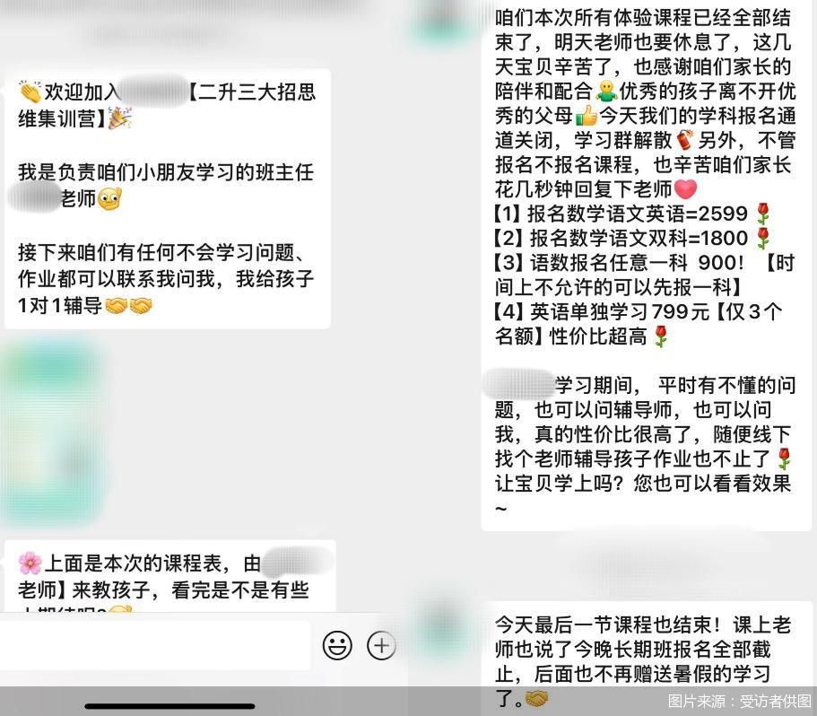 根据徐颖提供的聊天截图,教培机构老师推销的产品内容不仅包括“语文数学报名任意一科900元”“英语单独学习799元”等,甚至还有“特意向教研组申请了名额”“现在报名享受‘金牌辅导老师’”等话术,不断强调着“二升三”的重要性,甚至暗示不补课的“吃亏”,接连不断地推销线上网课。