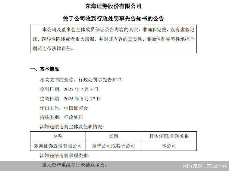 7月7日,东海证券发布关于公司收到行政处罚事先告知书的公告。公告指出,东海证券在担任金洲慈航集团股份有限公司(以下简称“金洲慈航”)2015年重大资产重组独立财务顾问的项目中,出具的相关文件存在重大遗漏、虚假记载,在独立财务顾问业务中未勤勉尽责。