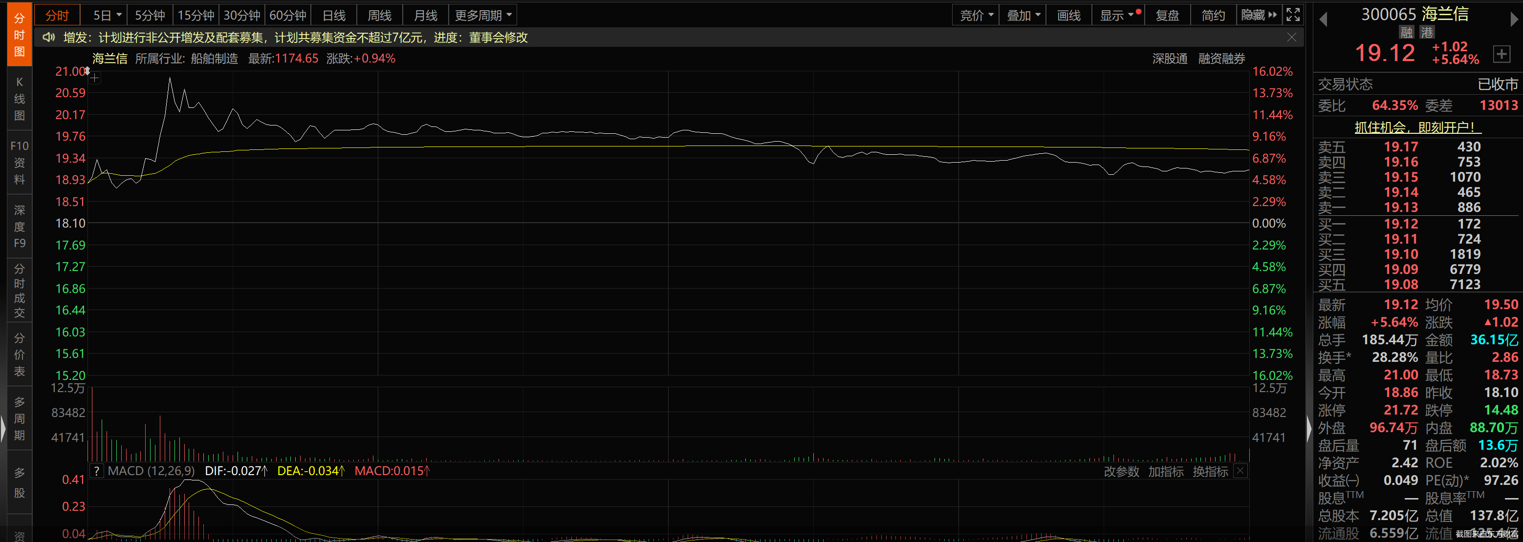 交易行情显示,8月13日,海兰信股价高开4.2%,开盘后公司股价出现拉升,早盘期间一度涨超15%。之后,公司股价涨幅有所收窄。截至收盘,海兰信股价收涨5.64%,报19.12元/股,总市值137.8亿元,当日成交金额36.15亿元。