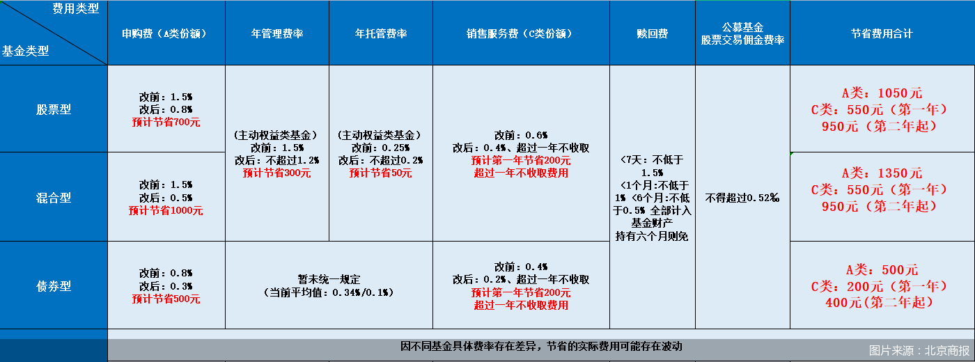 不少业内分析人士也为投资者算了一笔账。经济学家、新金融专家余丰慧指出,对于一位普通投资者来说,假设用10万元购买基金,一年能够节省的费用取决于具体的基金类型和费率变化情况。以股票型基金为例,若认申购费率上限调降至0.8%,销售服务费率调降至0.4%/年,相比之前的标准费率,投资者可能会节省几百元至1000多元不等的费用。不同类型的基金由于费率结构差异,节省的具体金额也会有所不同。债券型基金和货币市场基金的费率通常低于股票型基金,因此节省的金额相对较少。