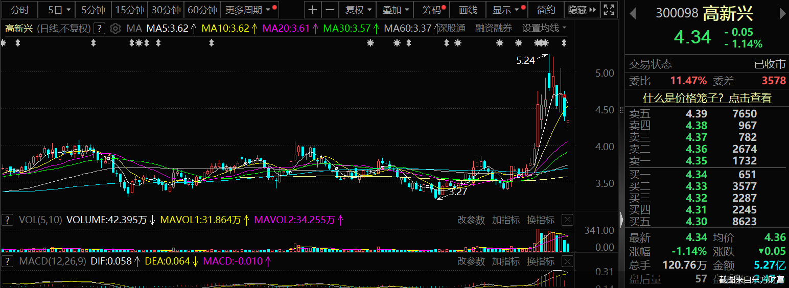 10月18日,高新兴股价开始进入下行通道,当日大幅收跌8.3%。经统计,在10月18日-23日这4个交易日,高新兴区间累计跌幅为12.15%。截至10月23日收盘,高新兴股价报4.34元/股,当日收跌1.14%,总市值为75.42亿元。