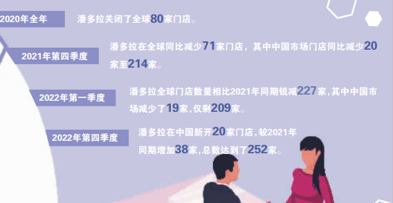 潘多拉此前财报显示,2020年全年,潘多拉关闭了全球80家门店;2021年四季度,潘多拉在全球同比减少71家门店,其中中国市场门店同比减少20家至214家;2022年一季度,潘多拉全球门店数量相比2021年同期锐减227家,其中中国市场减少了19家,仅剩209家。